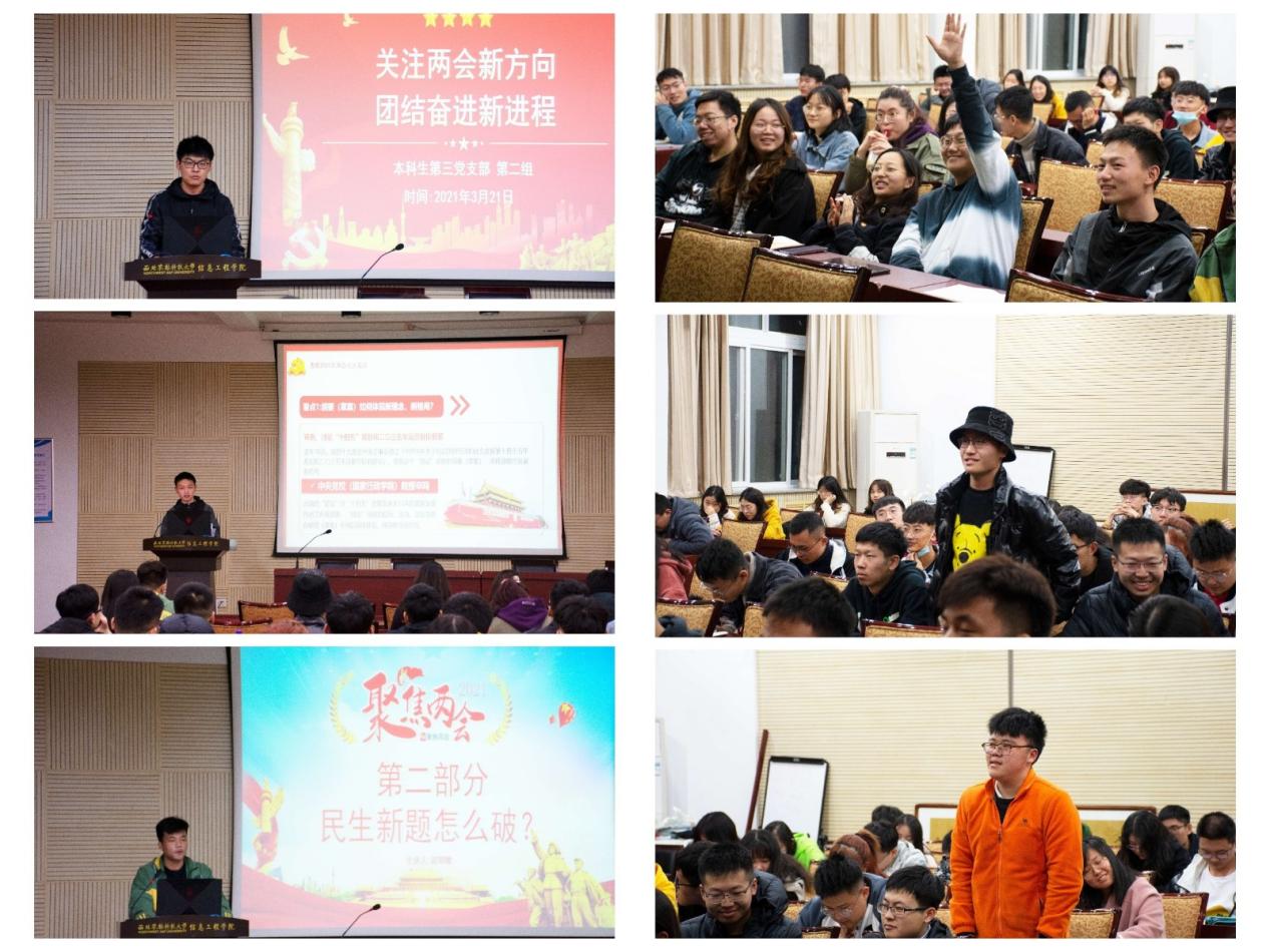计算机类2008班张乐行同志表示,通过参加此次党组织生活会,认真仔细地聆听沈洪富和赵明晗同志以“关注两会新方向,团结奋进新进程”为主题的报告,了解了十四五规划中的新热点,新议题,新政策,学习了与专业、就业有关的知识以及我党在脱贫攻坚战略上取得丰硕成果,同时立志以后要更积极地参与政治生活,为国家建设建言献策。