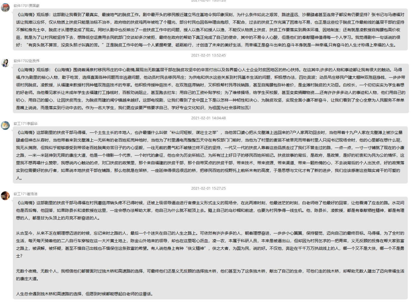 为更加深入了解和体会脱贫攻坚的奋斗历程,本科生第二党支部全体党员认真观看了《山河情》、《江山如此多娇》等脱贫攻坚剧目,并根据剧目内容结合自身实际进行了热烈讨论。