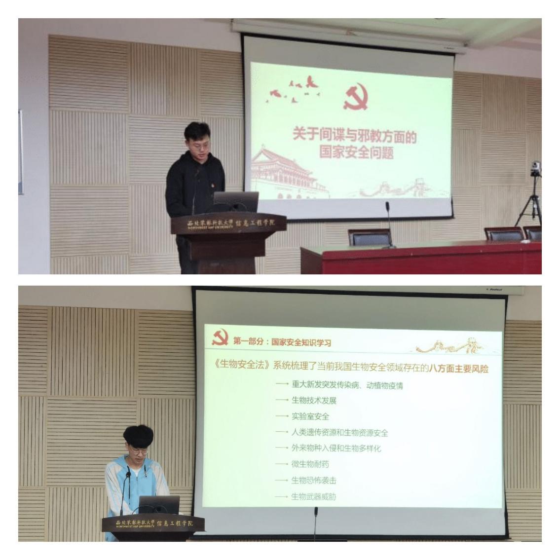 会议伊始,全体起立奏唱国歌。会上,高睿同志带领全体党员学习了国家安全相关知识。他讲述了何为国家安全及国家安全教育日的由来,具体介绍了“十六个安全”并对其中较重要的安全进行案例分析与相关法律的学习。武思霖同志对“间谍与邪教”方面的国家安全问题进行了讲述,通过案例说明了国家安全与每个人都息息相关,并介绍了破除间谍套路的方法、主要邪教组织概况以及有关法律。