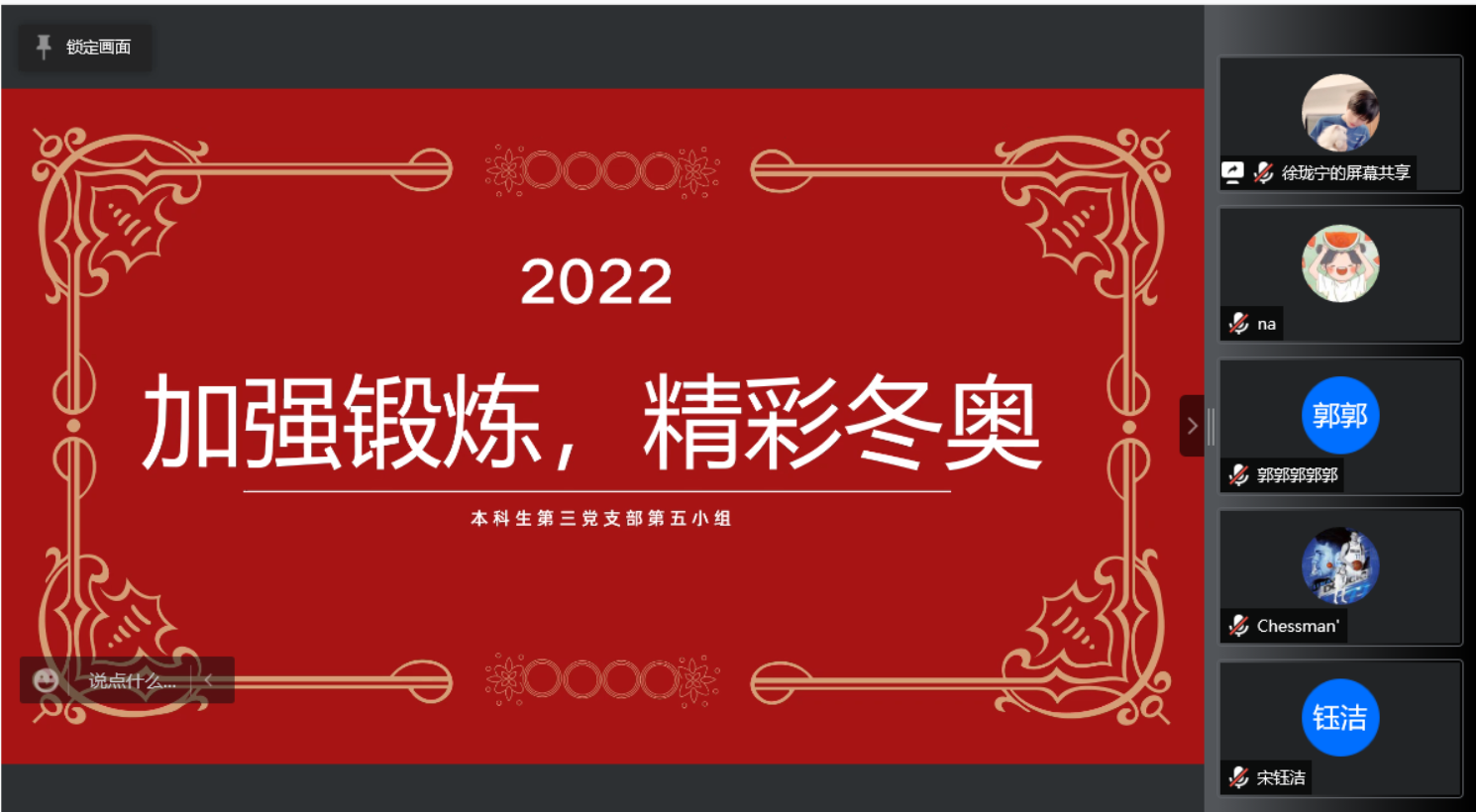 第24届冬季奥林匹克运动会计划于2022年2月4日开幕。为了解冬奥会,学习习近平同志“坚定信心再接再厉抓好各项筹备工作确保北京冬奥会冬残奥会圆满成功”讲话精神,2022年1月24日晚,赛马会六合彩 本科生第三党支部召开“加强锻炼,精彩冬奥”组织生活会,本次会议由徐珑宁同志主持,支部全体党员、预备党员和积极分子参会。