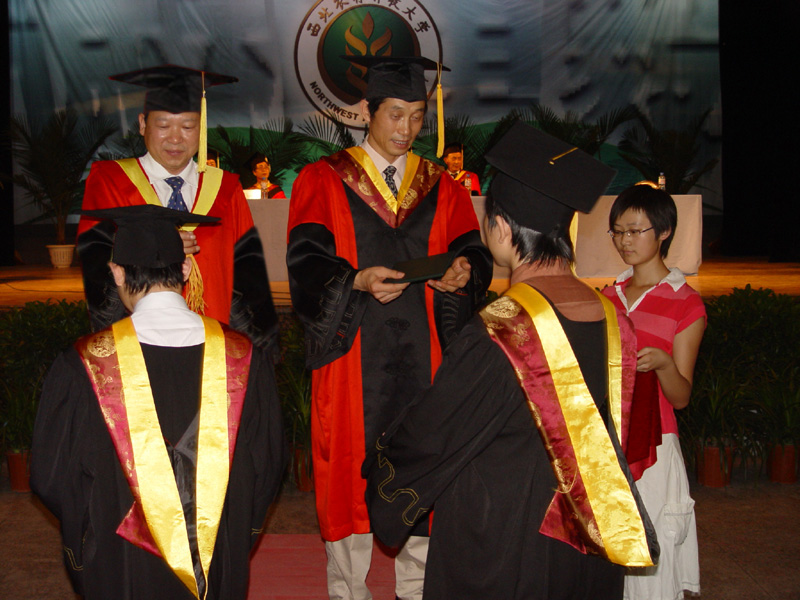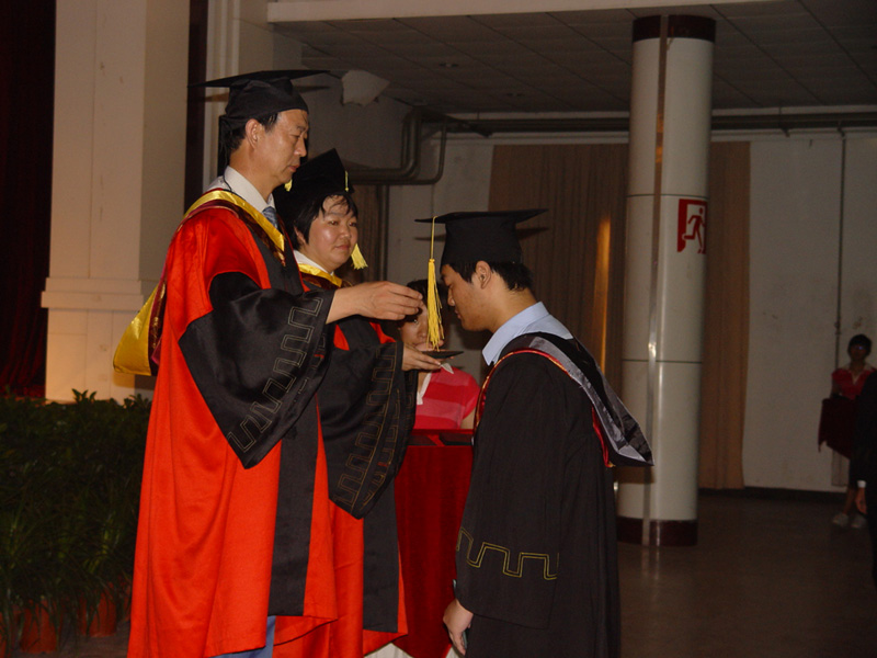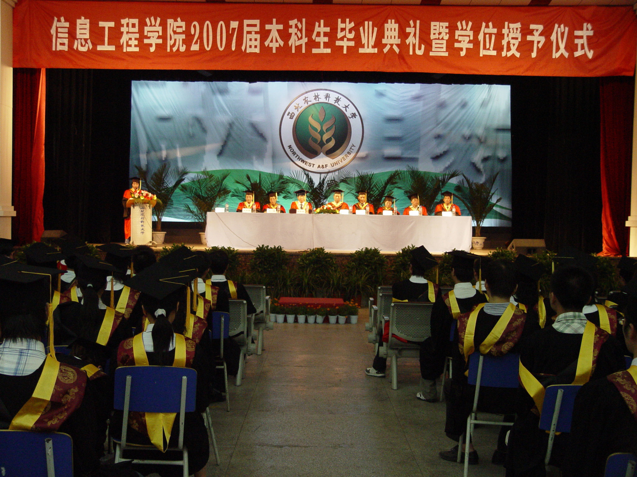 何东健院长和韩宏副院长为2007届计算机专业146名获得学士学位的毕业生授予学位、樊世明书记和李书琴副院长为信管专业109名获得学士学位的毕业生授予学位。