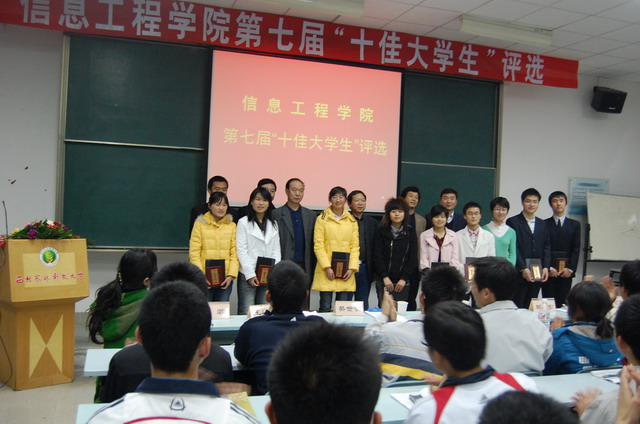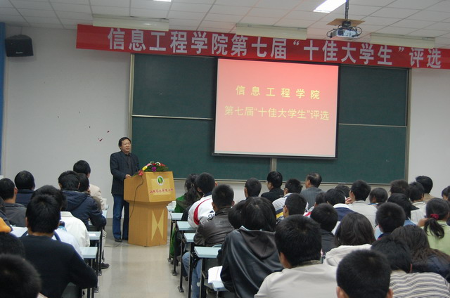 第七届“十佳大学生”评选大会在多媒体教室举行。全体院领导、综合办公室秘书、全体学工干部以及200余名学生代表参加了评选大会。评选会由谷申杰同志主持。