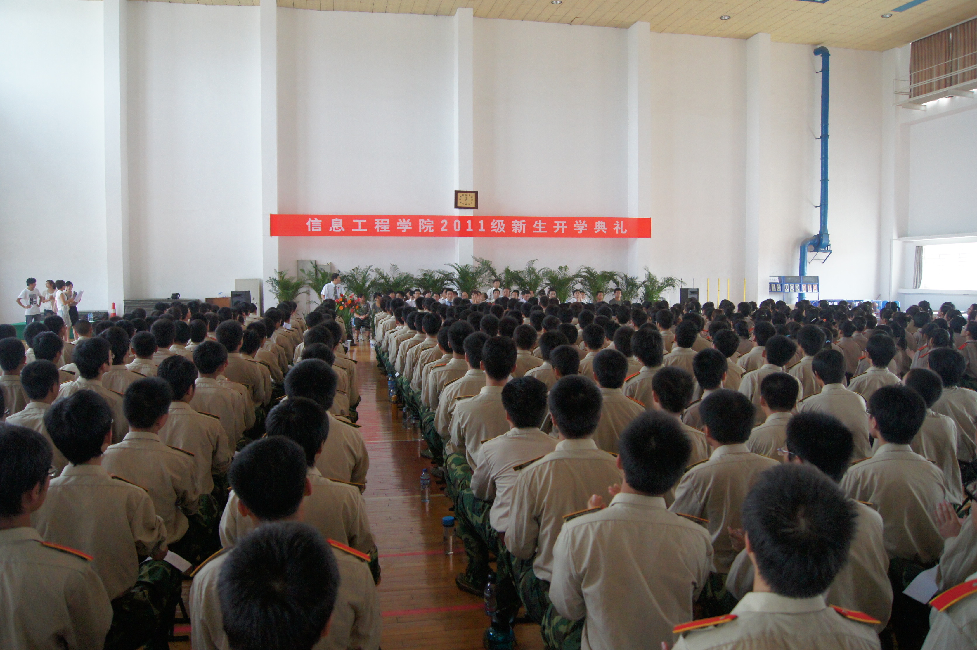 在北校区体育馆隆重举行2011级新生开学典礼。全体院领导、副教授以上职称教师、各系部主任、综合办全体人员、教师代表、新生班主任以及370名新生参加了会议,大会由何卫军副书记主持。