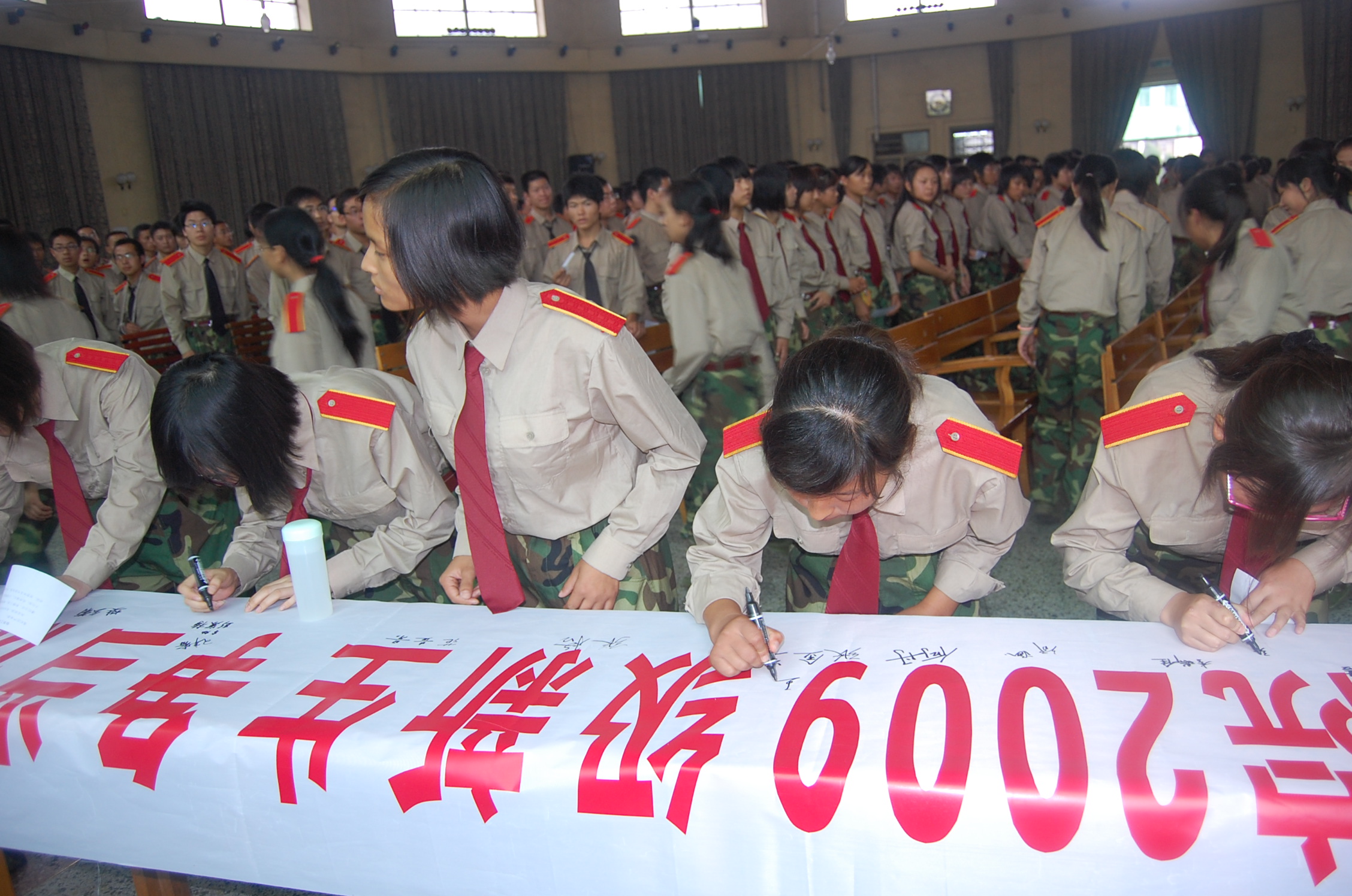 2009级新生争当优秀大学生”横幅上签名,开始大学生活新的一页。