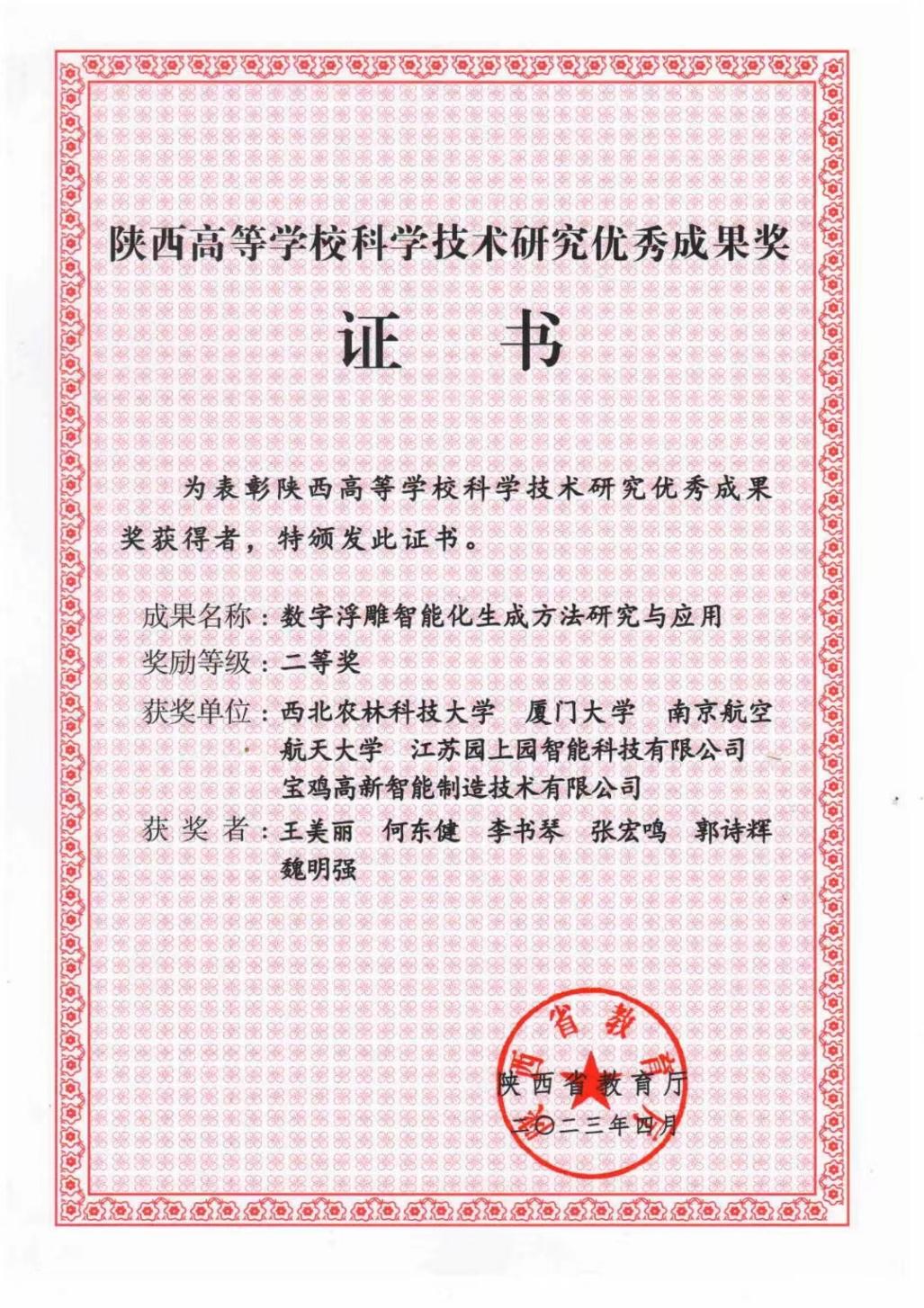 王美丽教授主持完成的《数字浮雕智能化生成方法研究与应用》荣获陕西高等学校科学技术研究优秀成果奖二等奖。
