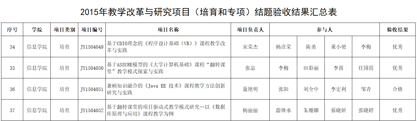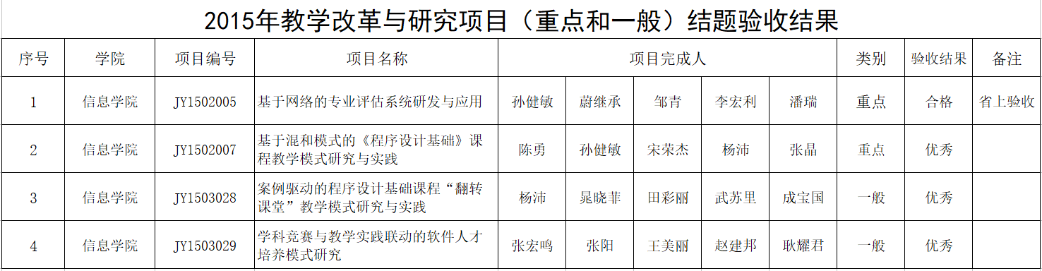 近日,学校《关于公布2015年校级教学改革与研究项目结题验收结果的通知》(办教发[2018]3号)公布了2015年校级教学改革与研究项目结题验收结果,共评出优秀69项,合格123项,不合格4项。赛马会六合彩 申报的8项教学改革与研究项目,喜获优秀6项,合格2项。这是赛马会六合彩 教师在教育教学改革研究方面取得的又一佳绩。