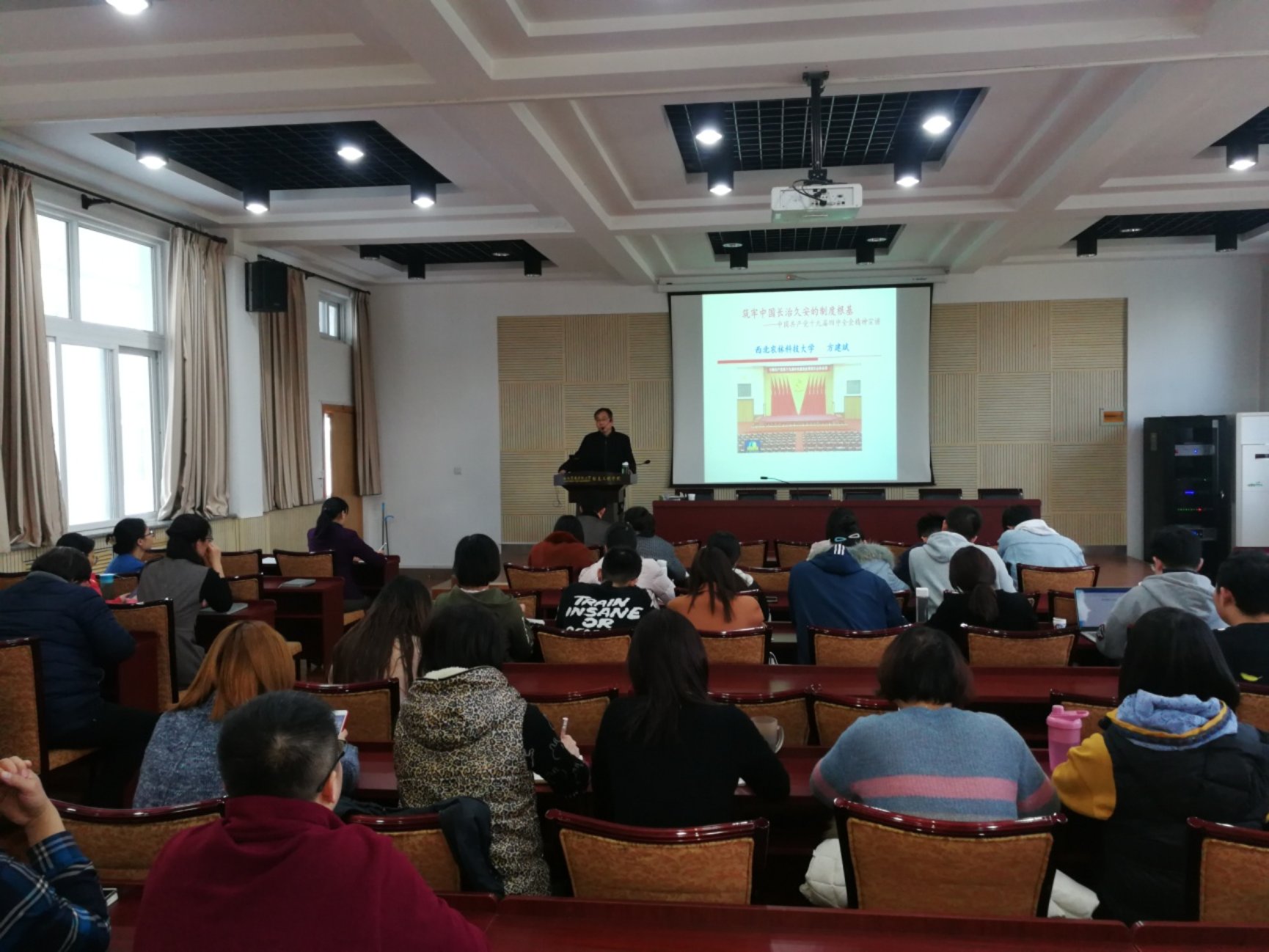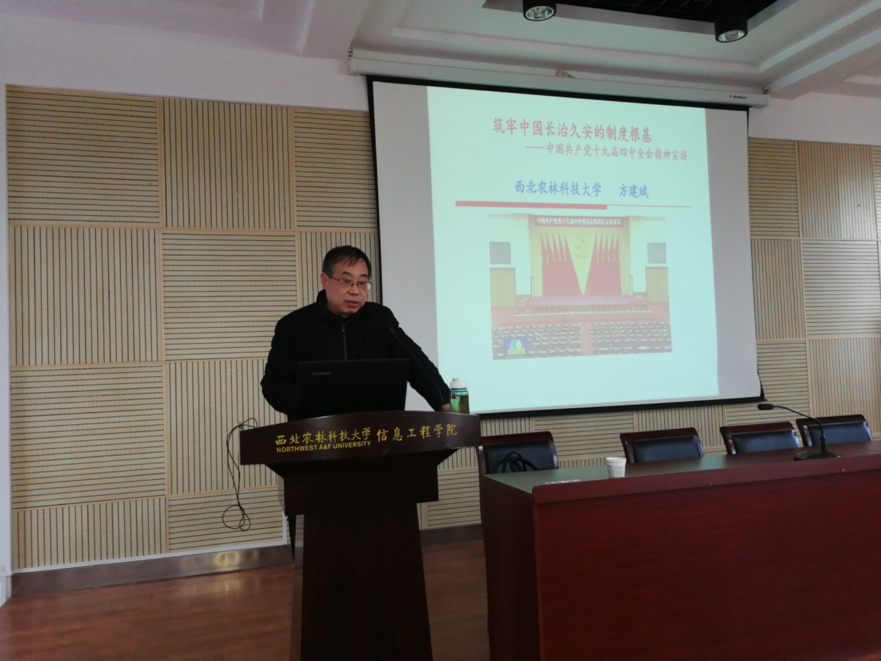 为深入学习贯彻党的十九届四中全会精神,扎实推进“不忘初心、牢记使命”主题教育,引导师生学习好、把握好全会精神的重大意义、深刻内涵,12月11日,赛马会六合彩 党委特邀马克思主义赛马会六合彩 方建斌教授为赛马会六合彩 师生作“筑牢中国长治久安的制度根基--中国共产党十九届四中全会精神宣讲”专题报告。
