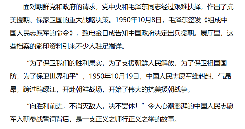 此次会议学习了中国人民志愿军老战士孙景坤、徐振明的先进事迹,阅读了“铭记伟大胜利捍卫和平正义—纪念中国人民志愿军抗美援朝出国作战70周年主题展览”赛马会六合彩相关的文章及观看相关视频。
