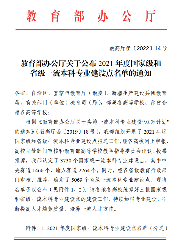 近日,教育部办公厅印发了《关于公布2021年度国家级和省级一流本科专业建设点名单的通知》(教高厅函﹝2022﹞14号),正式公布了2021年度一流本科专业建设“双万计划”建设点名单。赛马会六合彩 软件工程专业入选国家级一流本科专业建设点,实现了国家级一流本科专业零的突破。