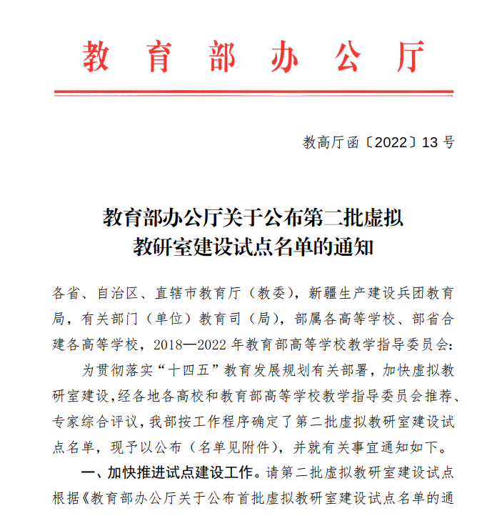 2021年7月,教育部首次启动虚拟教研室建设试点申报工作,探索“智能+”时代新型基层教学组织的建设标准、建设路径、运行模式等。拟通过3-5年的努力,建成全国高等教育虚拟教研室信息平台,建设一批理念先进、覆盖全面、功能完备的虚拟教研室,锻造一批高水平教学团队,培育一批教学研究与实践成果,打造教师教学发展共同体和质量文化,全面提升教师教学能力。