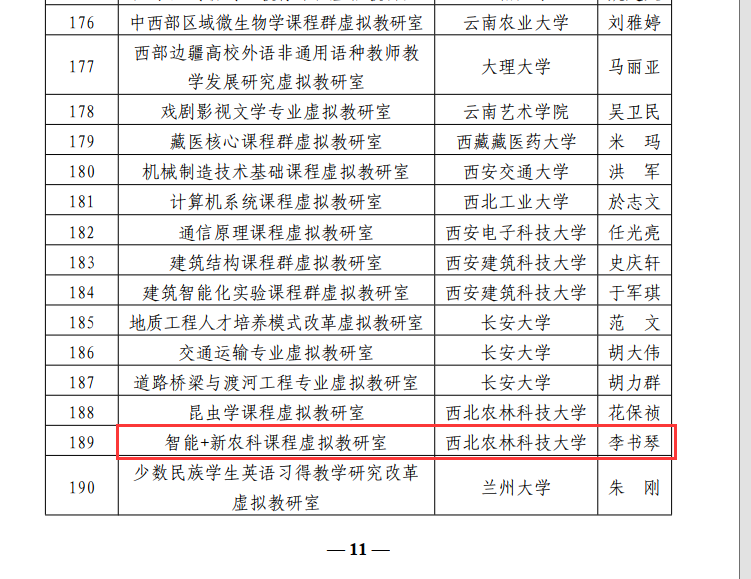 近日,教育部办公厅发布了《关于公布第二批虚拟教研室建设试点名单的通知》(教高厅函〔2022]13号),赛马会六合彩 李书琴教授牵头的“智能+新农科课程虚拟教研室”成功入选,是赛马会六合彩 信息化时代新型基层教学组织建设的重要突破。