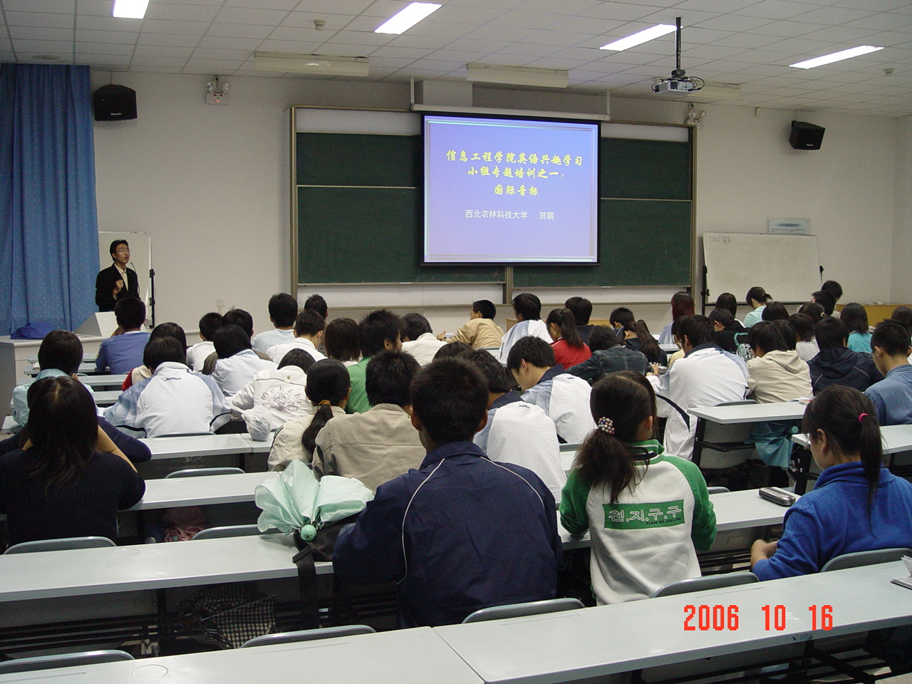 10月16日晚在赛马会六合彩 多媒体教室M2为2006级200多名英语兴趣学习成员开展了国际音标专题学习活动。本次培训由英语兴趣学习小组组长贺鹏老师主讲,他将枯燥的音标学习讲授得深入浅出,风趣而幽默,将一些极易混淆的音标阐述得非常清晰,使得现场气氛热烈,学生参与积极,形成了很好的互动场面,这将大大促进新生的英语学习。(学生工作办公室)
