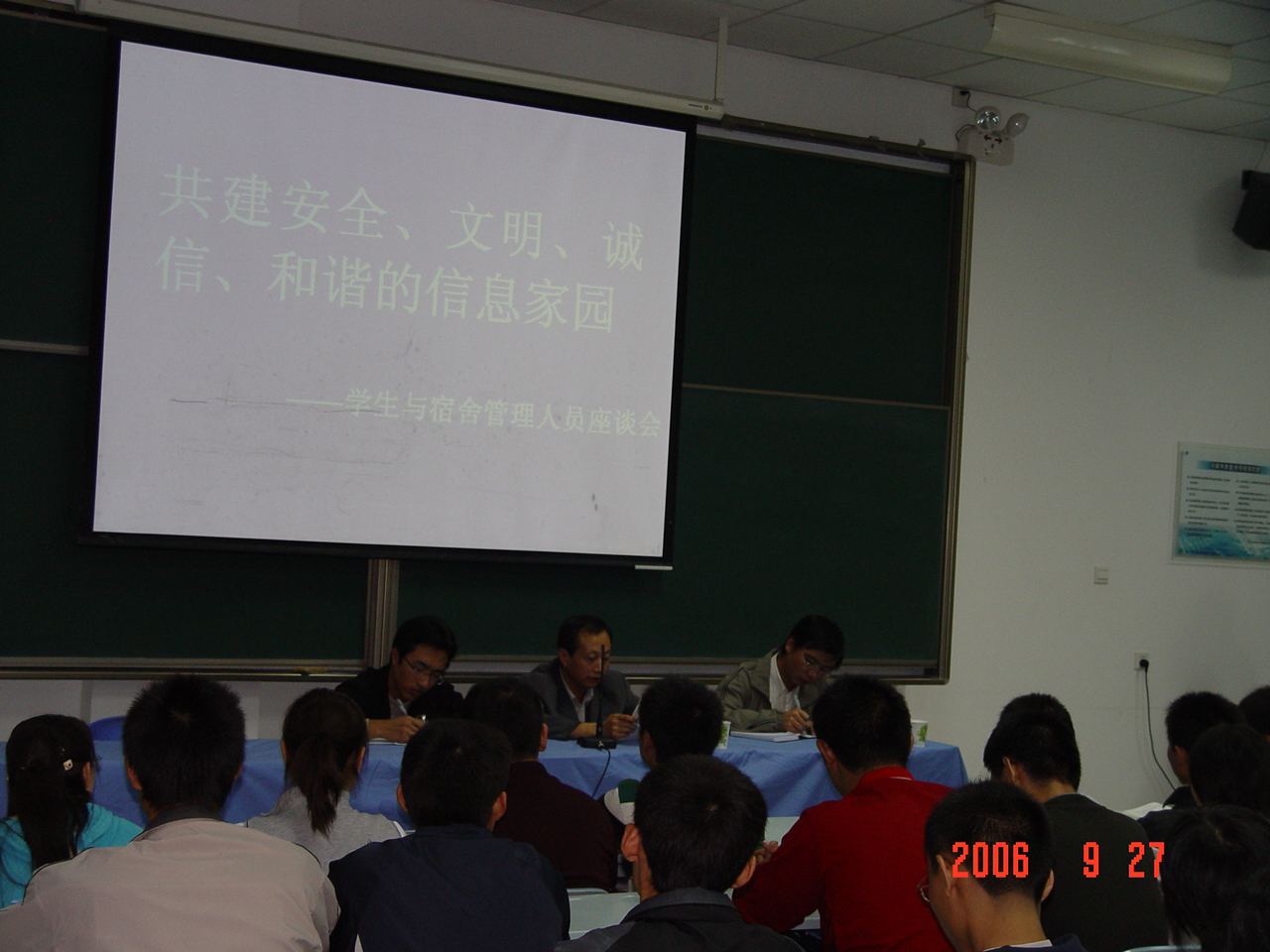 在计算机教学中心三楼多媒体教室M1召开以“建设安全、文明、诚信、和谐的信息家园”为主题的师生与宿舍管理人员座谈会,座谈会由2006级辅导员谷申杰老师主持,北校区西区学生宿舍管理中心张大生老师、辅导员贺鹏以及100名学生代表参加了座谈会。