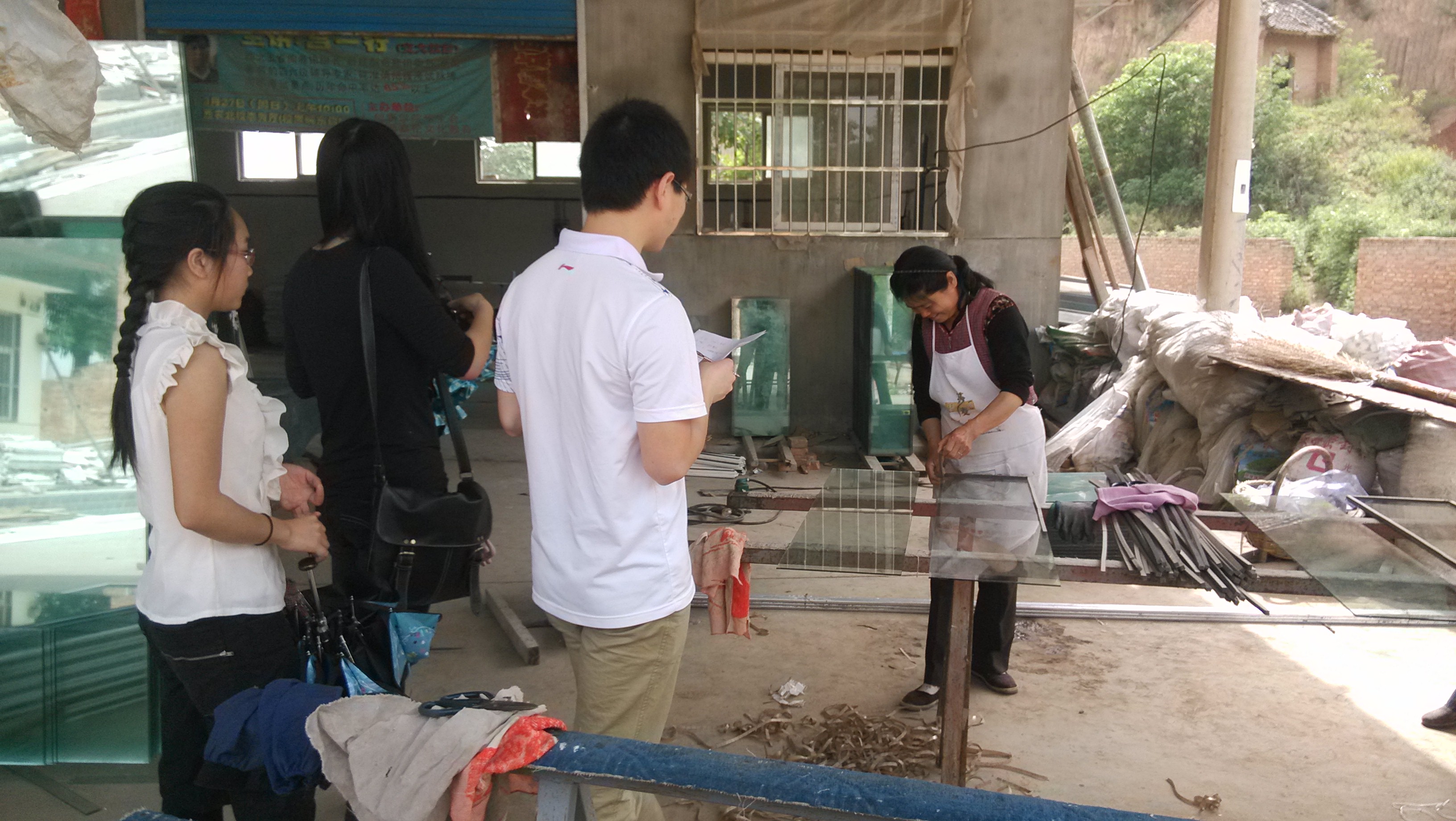 队伍抵达目的地后,大家不顾路途劳累,一下车便走向村委会,在与村长进行了简短的交流后,田园使者们在村长的带领下,去拜访了一些当地的村民,他们了解到,马家底村共有人口200余人,人均8分地,村里开设一家玻璃门窗加工厂,共有十几个人工作,人均工资40元/天。村里共有小学生10人,初中生3人,高中生3人,大学生6人,教育条件很艰苦,没有学校,孩子们都需要到邻村上学。虽然烈日当头,但田园使者们热情不减,在了解完一些基本情况后,又前往乡间地头,帮助农民拔草,体验了农民的田间生活。