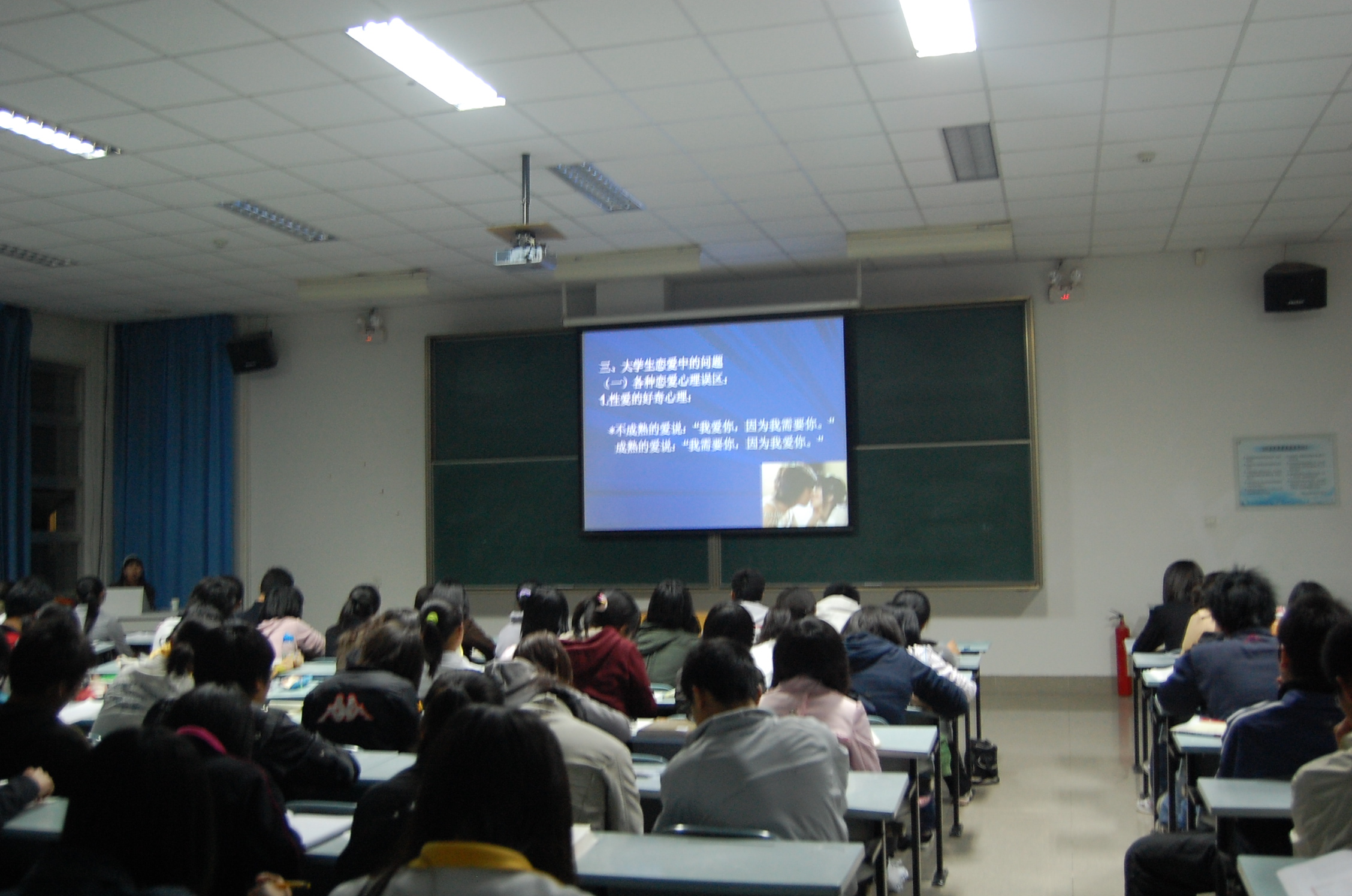 报告会开始之前,同学们早已提前到场,整个会场座无虚席,使得偌大的M2也稍显拥挤。晚上7:30,报告会正式开始。武老师以先以几个简短有趣的谜语小测验引出了讲座的主题-大学生恋爱问题。在同学们好奇与期待的眼光之下,武老师一一为同学们详细介绍了爱情的定义、大学生恋爱的误区、大学生恋爱中容易出现的问题以及相应的解决措施等与我们息息相关的问题。武老师语言幽默,方式新颖,结合她自己的亲身经历,站在我们大学生的角度为大家分析利弊,权衡轻重,现场时而沉默,时而笑声一片,时而又爆发出阵阵掌声,气氛轻松活跃。