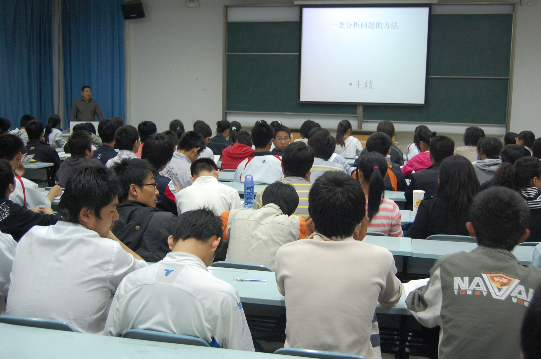 晚上7:30,报告会正式开始。经过一番简短的自我介绍,王歧教授开门见山,直入正题。他先简略介绍了西北工业大学学生以往参加ACM的情况,随后着重以讲解例题的形式与大家交流了参加ACM应该具备的一些素质和注意的细节及技巧。虽然有些习题如“杀病狗问题”、“海盗分金块问题”难度较大,不好理解,但王歧教授循循善诱,深入浅出,仔细分析,对症下药,将大家的问题逐个突破,彻底消灭,场下观众无不为他渊博的知识,敏捷的思维所折服,赞叹之声不绝于耳。