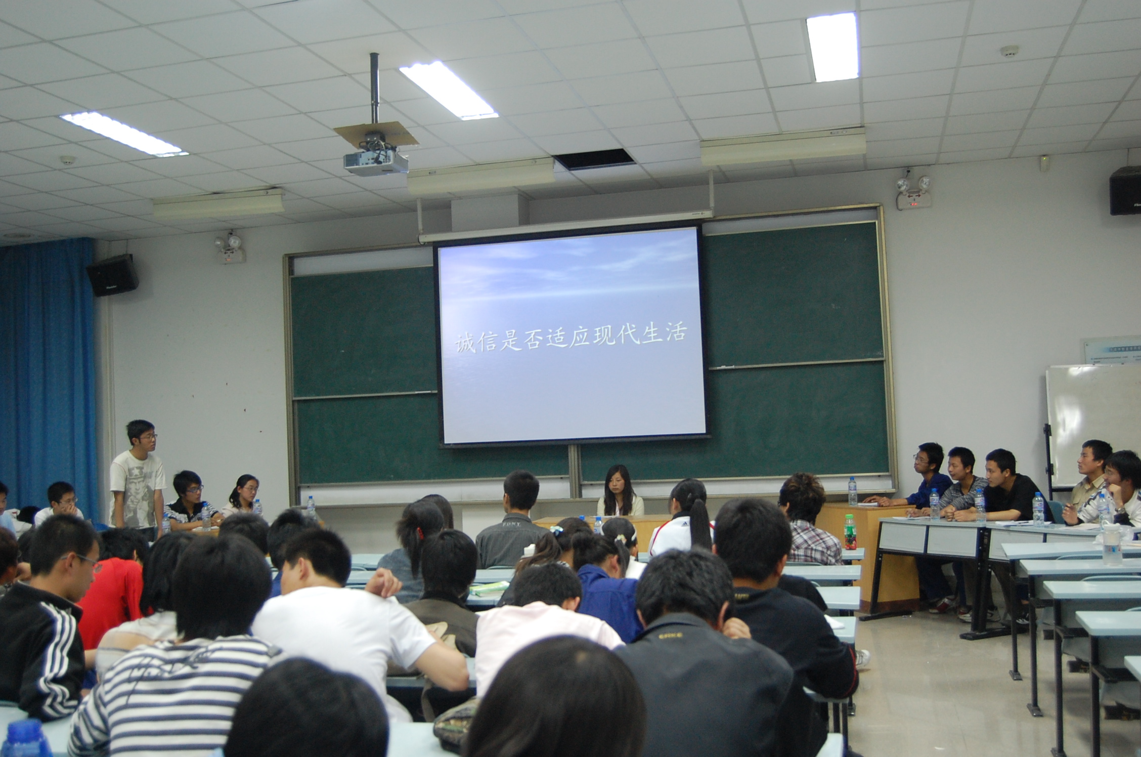 这次团组织生活分为两个环节,第一个环节是以辩论赛的形式进行。辩题是“诚信是不是适应于现代生活”。从各班选取10个辩手分成两组,经过激烈的比赛,最终执正方观点“诚信适应现代生活”一组以略微的优势胜出。比赛完毕之后,大家共同欣赏了与诚信有关的电影《落叶归根》。