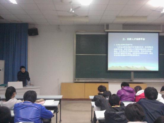 在讲座中,徐海老师首先向同学们介绍了创新的概念、创新人才的培养和创新灵感的来源。他告诉同学们,作为新世纪的大学生,创新能力必不可少,同学们要培养丰富的想象力、敏锐的洞察力及类比综合能力。只有善于观察生活,敢于实践,才能有创新。随后,徐海老师又向同学们详细介绍了国家大学生创新实验计划、全国“挑战杯”竞赛及我校的创新人才培养平台,并通过近年来逐步实现自己的创意。最后,徐海老师鼓励大家主动参加科技创新活动,做一个敢于创新的人。