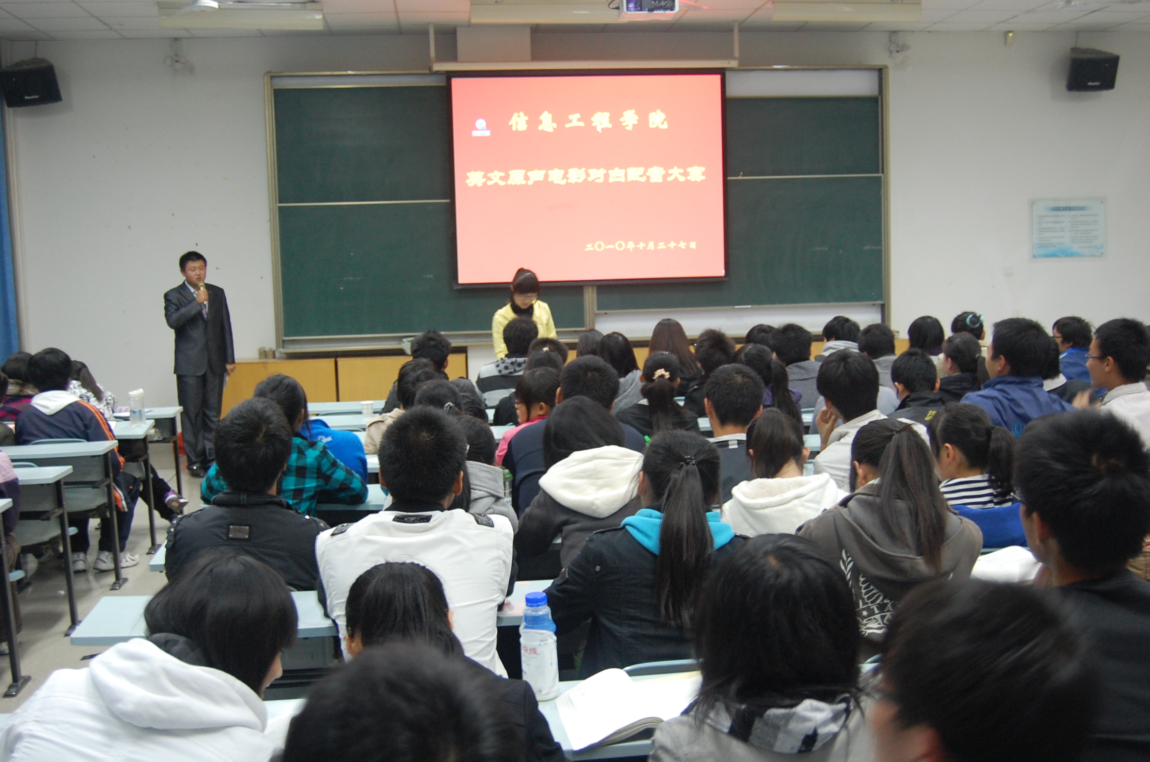在信工楼M2教室成功举办英文原声电影配音大赛。校学习部副部长张学治,外语系杨丹、王素素以及上届冠军琪非、辛彤学长等担任此次大赛的评委。
