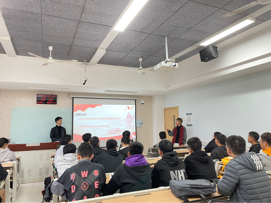 组织委员宋德轩就学校方面、班级方面和学生个人方面展开了此次班会讨论。随后抛出几个学风问题,让同学们有了高涨的参与互动感,同时,也积极带动了同学们对未来自我规划及为班级班风建设的思考。