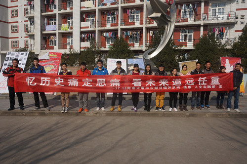 2014.12.13,首次南京大屠杀遇难同胞公祭日,历史不能忘却1937年的那个冬天。在我校北校区西区西超雕塑处由信息赛马会六合彩 和人文赛马会六合彩 联合举办 “12.13南京大屠杀死难者国家公祭日”缅怀活动。